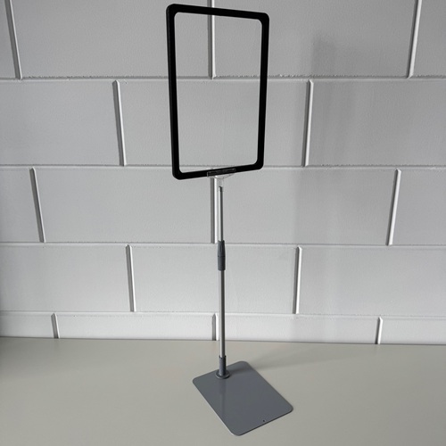 Standaard A4 zwart raam met transparant T-stuk, verstelbare aluminium buis en metalen grijze voetplaat. Verstelbaar/ uitschuifbaar van 32 tot 58 cm.Dit is voor ons een samengesteld artikelnummer uit 4 andere artikelnummers. Bij >Gerelateerde artikelen< kunt u de huidige voorraad zien.