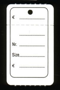 Hangetiket op rol 30x50mm zwart bedrukt 1000 per rol, wel ponsgaatje, en wel perforatie in kaartjeSpecificaties
