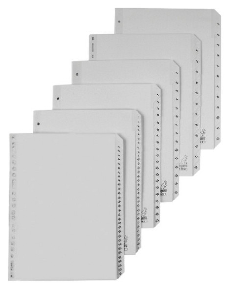 * Tabbladen van grijs PP 120 mµ.*De tabs zijn éénzijdig zwart bedrukt met cijfers.